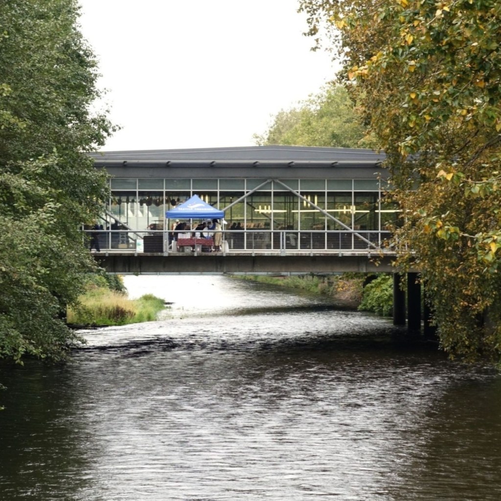 The Cedar River flows through the city of Renton, even under the library, where people gather to watch the salmon return.