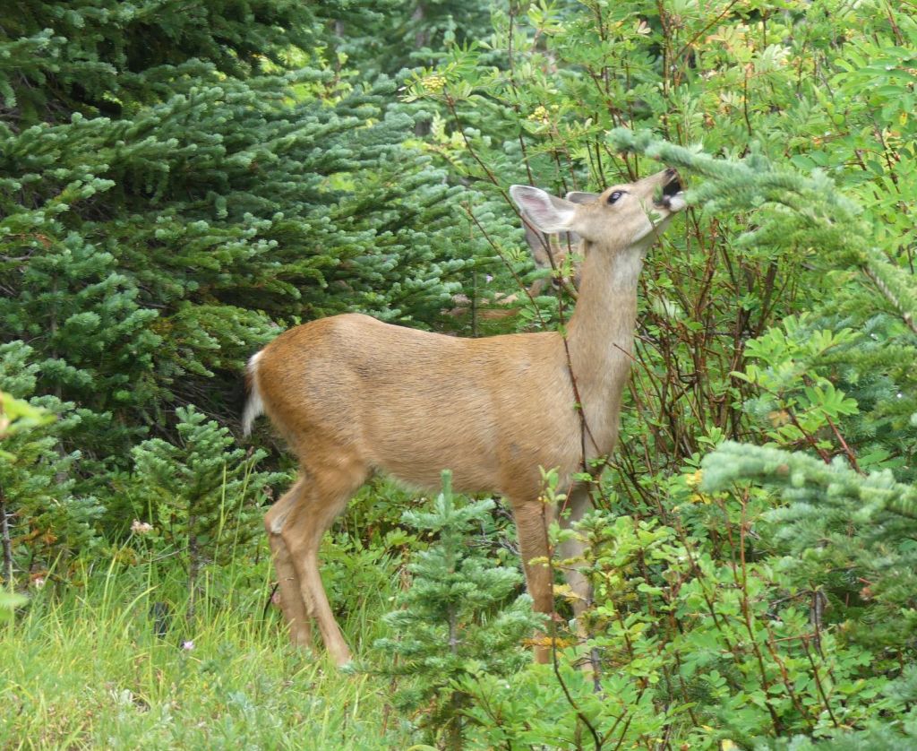 I wore open-toed sandals, so my feet got wet, but I had a windbreaker and hat and was otherwise warm. The deer didn’t seem to mind the rain at all, and they were out feeding on the lush foliage.