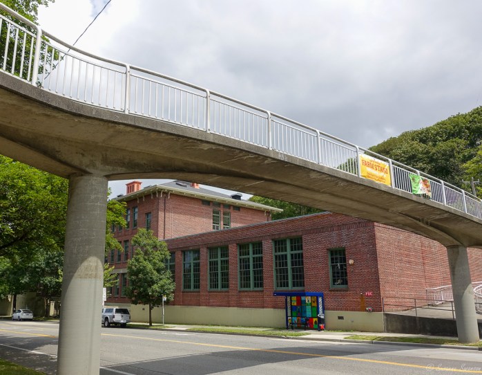 The overpass is still there, too. We used it to cross Delridge Way, helped by students on patrol, wearing hat, and sash. Some on patrol, extended their flags with a sing-song ‘ready-walk’ to help us cross side streets below.