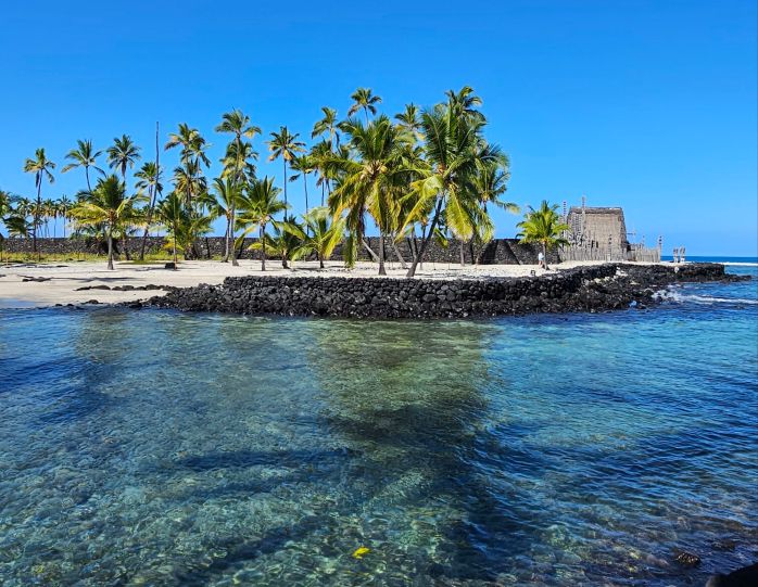 From the Place of Refuge, Pu’uhonua o Honaunau National Historical Park, an important ceremonial site where people could escape to, if they broke the law (kapu).