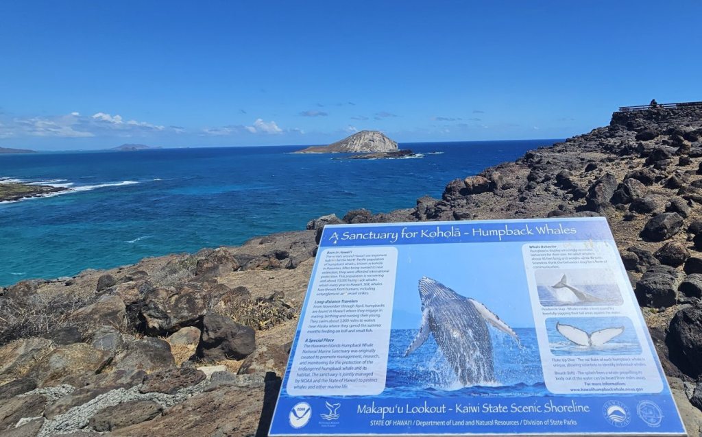 Next was Makapu’u Overlook, with offshore islands in the distance and information about the Sanctuary for Humpback Whales. Humpbacks are in Hawaii from November to April, same time as I’d like to be there.