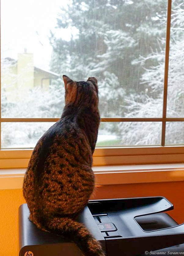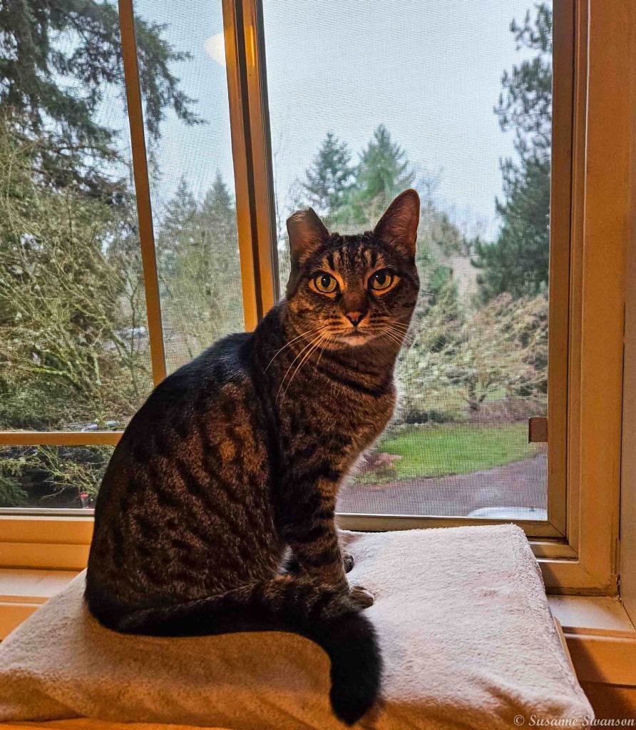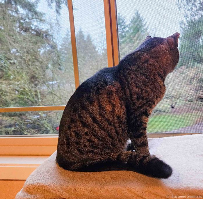 1. Cats do love to look out of windows. Especially when there is a lot of bird activity around feeders. Benji really does look the same, even with one less leg.