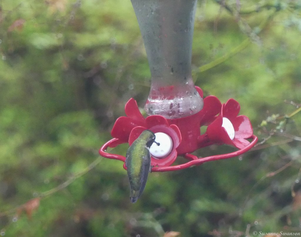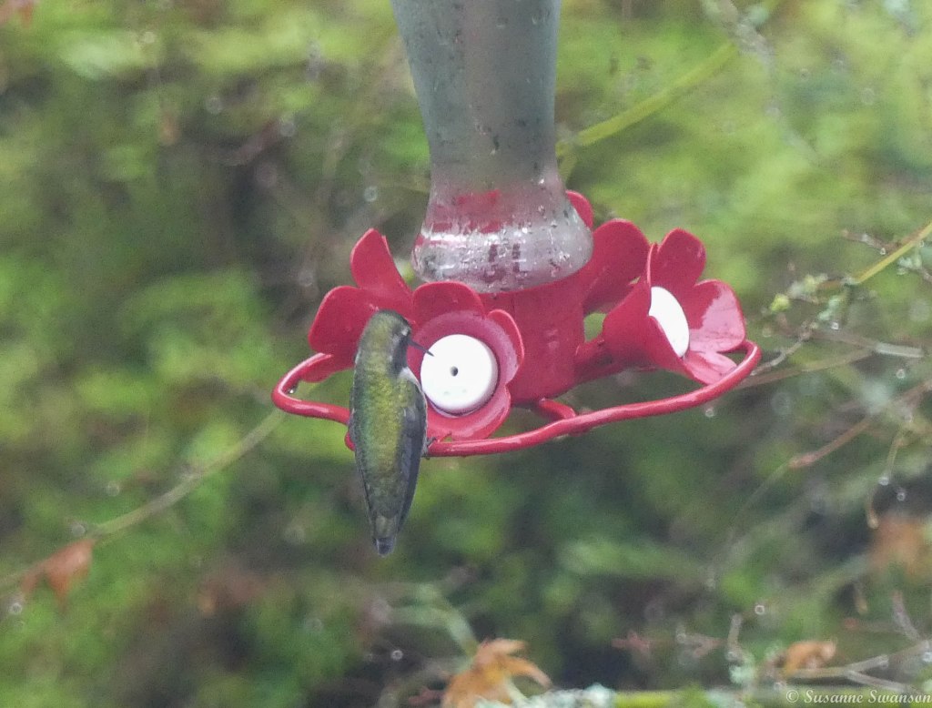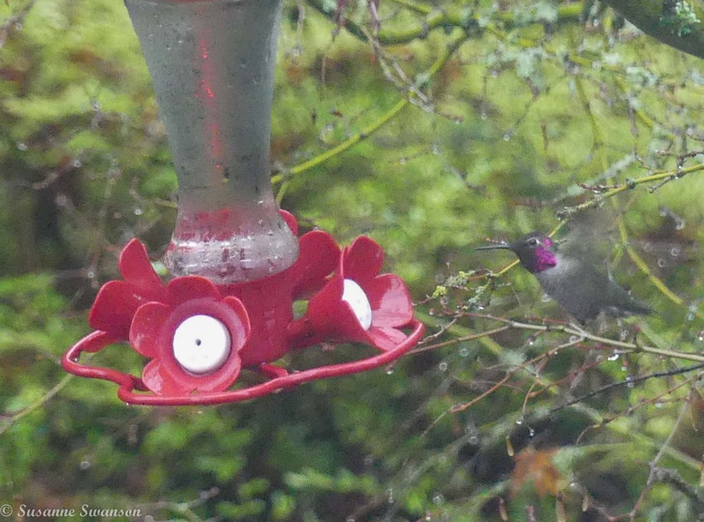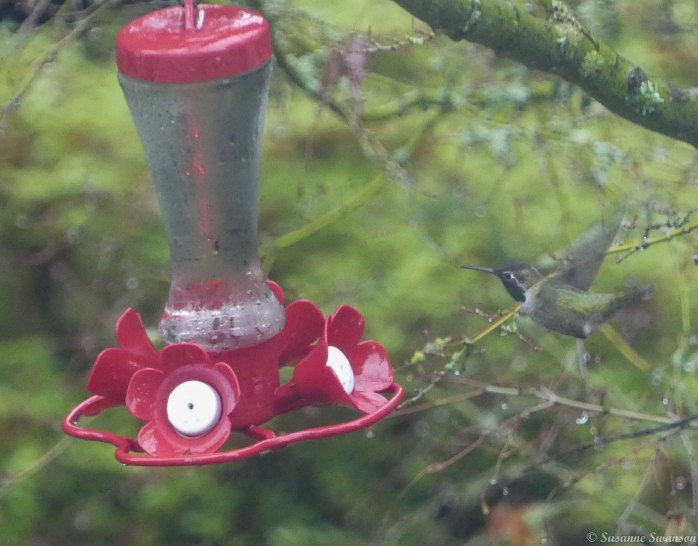 This morning, I replenished the feeder in front, and the hummingbirds appreciated it. They deplete their sugary drink faster here probably because of the better tree cover.