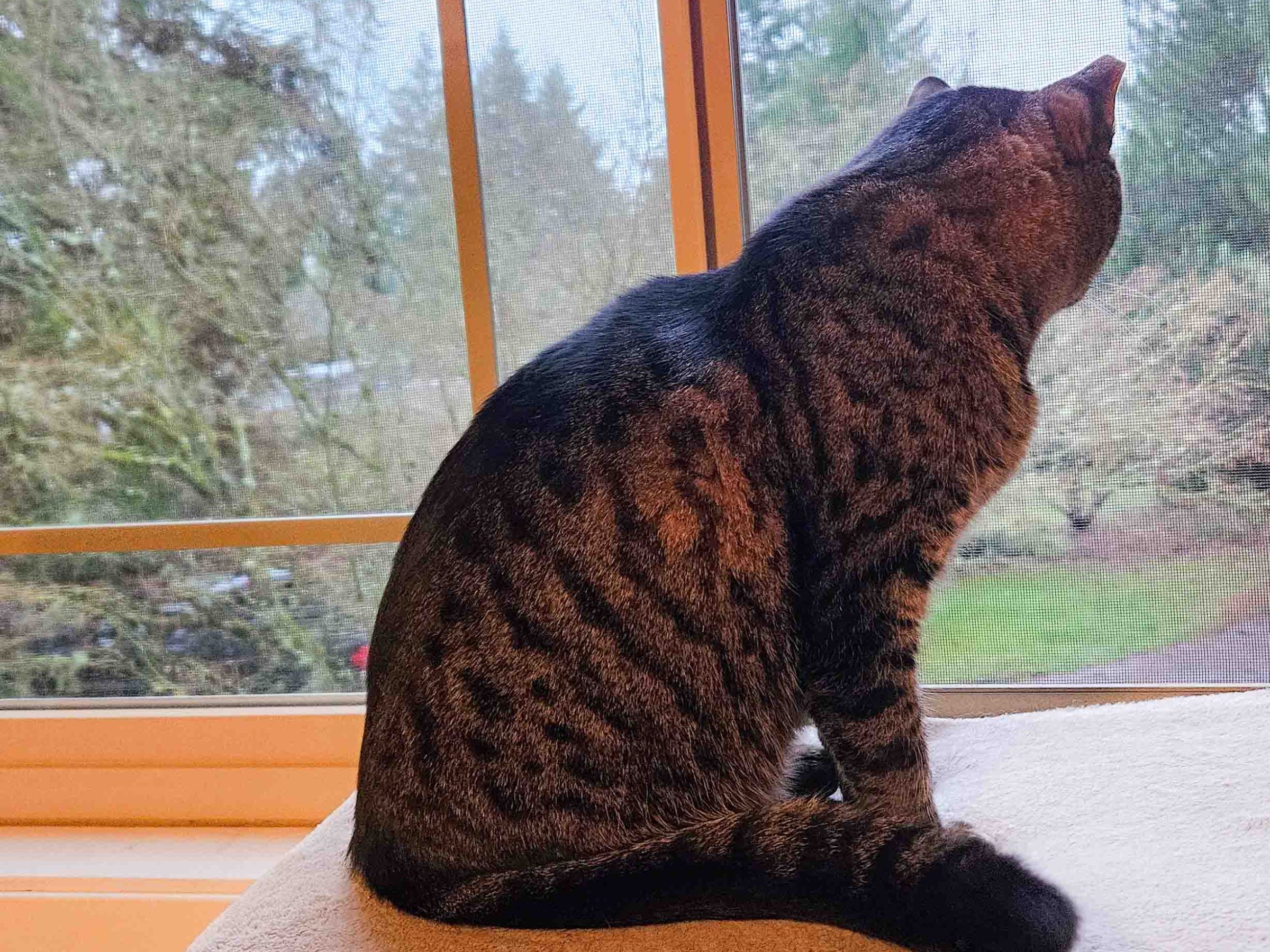 1. Cats do love to look out of windows. Especially when there is a lot of bird activity around feeders. Benji really does look the same, even with one less leg.