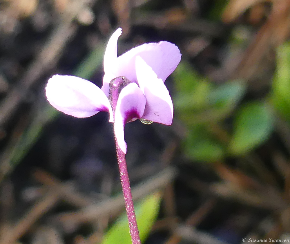 Flowers are beginning to appear among the fallen leaves and pinecones, this a tiny Cyclamen;