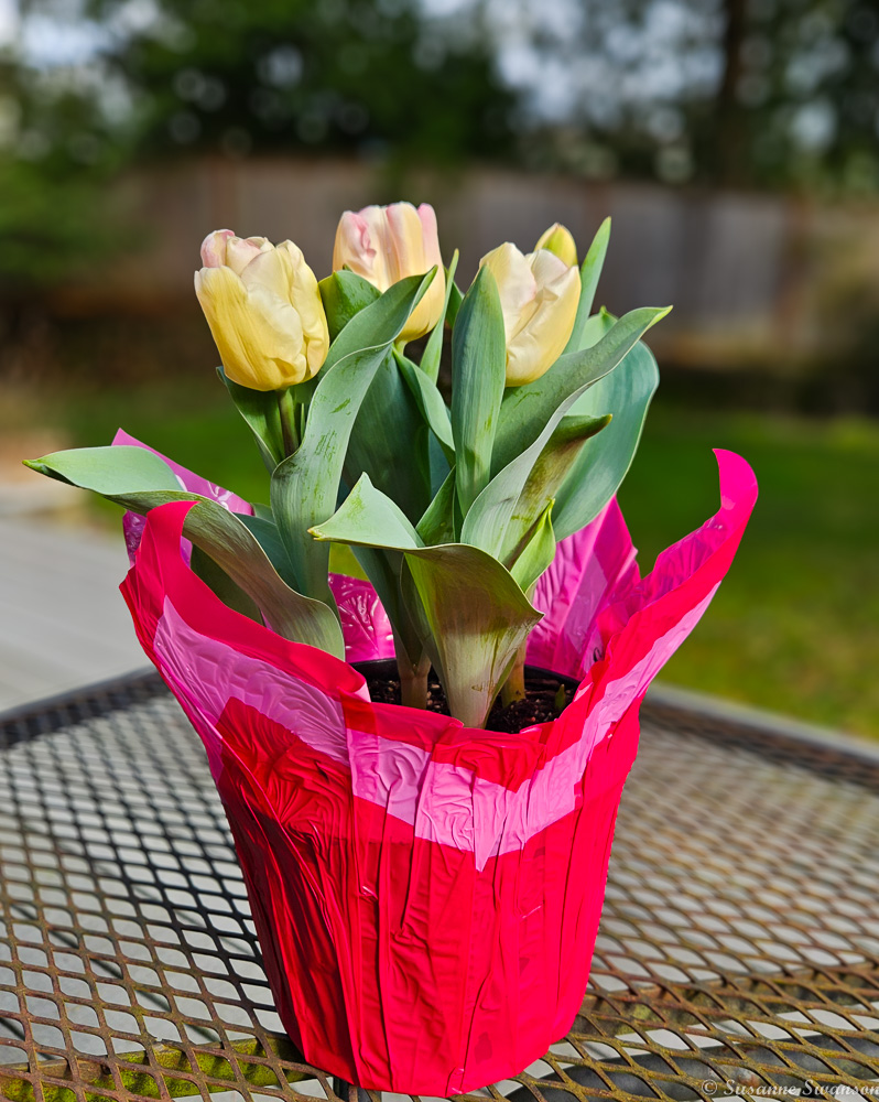 For more color, I picked up a pot of tulips when I was out and about this weekend;