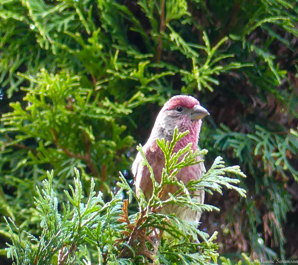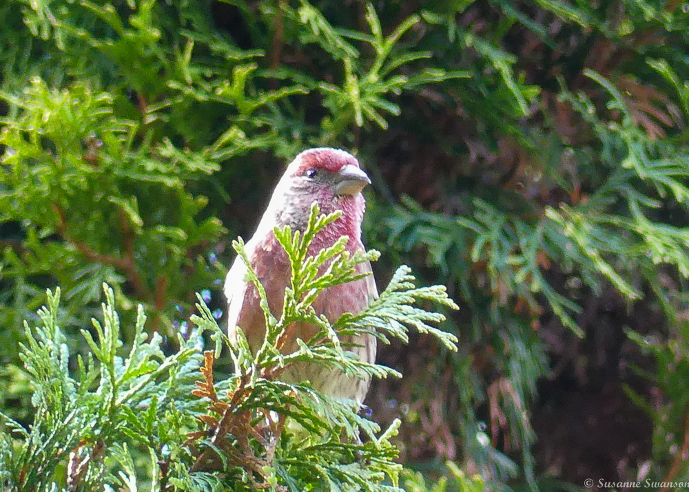 House finches prefer the arborvitae in back, this male looking fine, sings to woo a mate.
