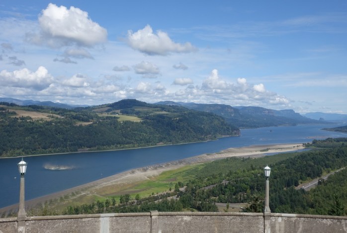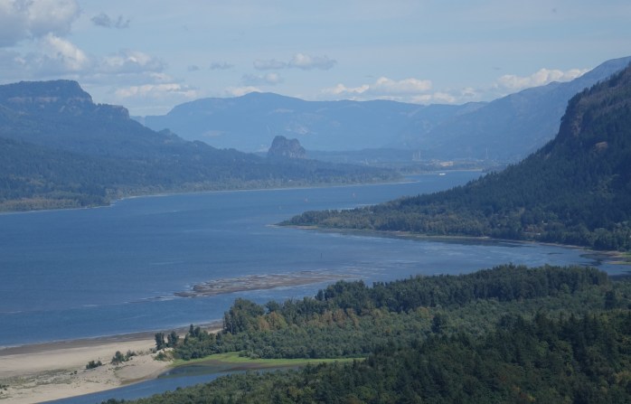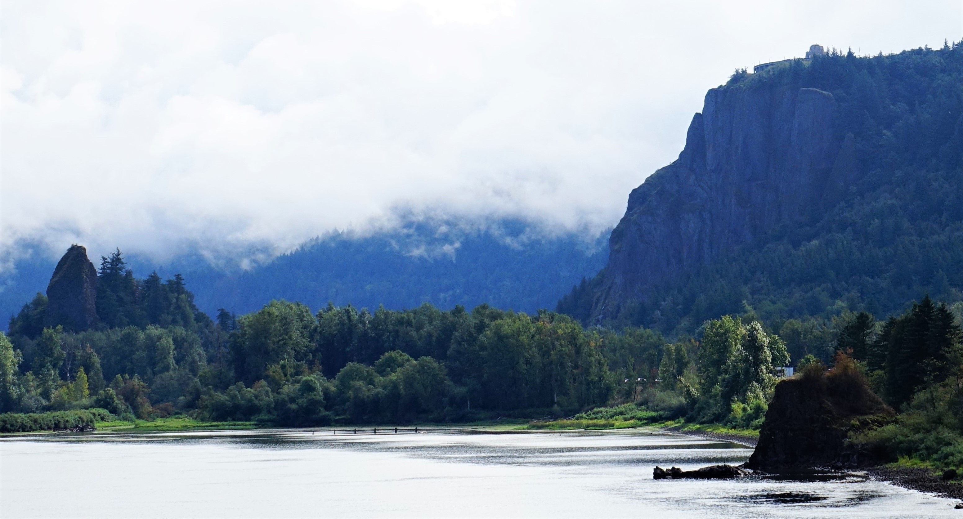 I forgot to get a picture of Vista House but here’s how it looks from below. Look carefully at the top of the cliffs to the right and you’ll see the tiny knob 733 feet above. I took this as we were leaving the Gorge a couple days later, after the clouds had rolled in.