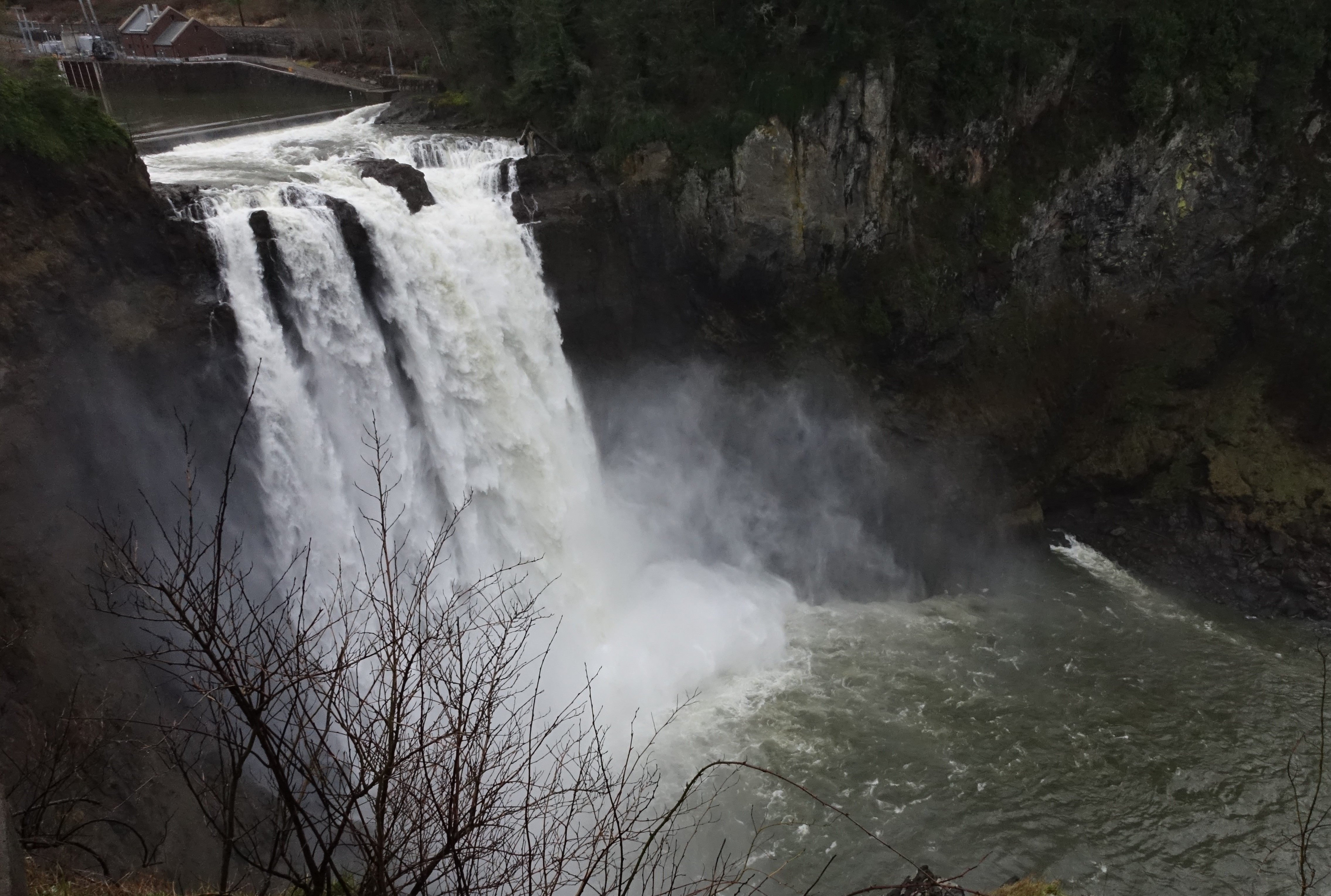 The day before the snow arrived – it seems so long ago – we went to Snoqualmie Falls, one of our favorite local attractions. The Falls are an easy drive from Seattle and a place to wow your out-of-town guests. Or to celebrate a special event like I did with brunch when I graduated from college. Or to impress your date with a fancy dinner as Bob did me so many years ago.