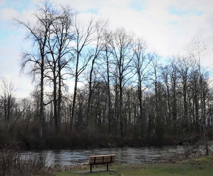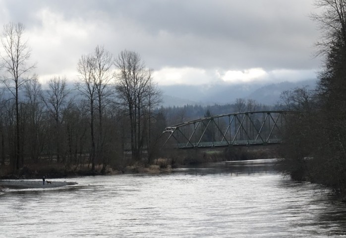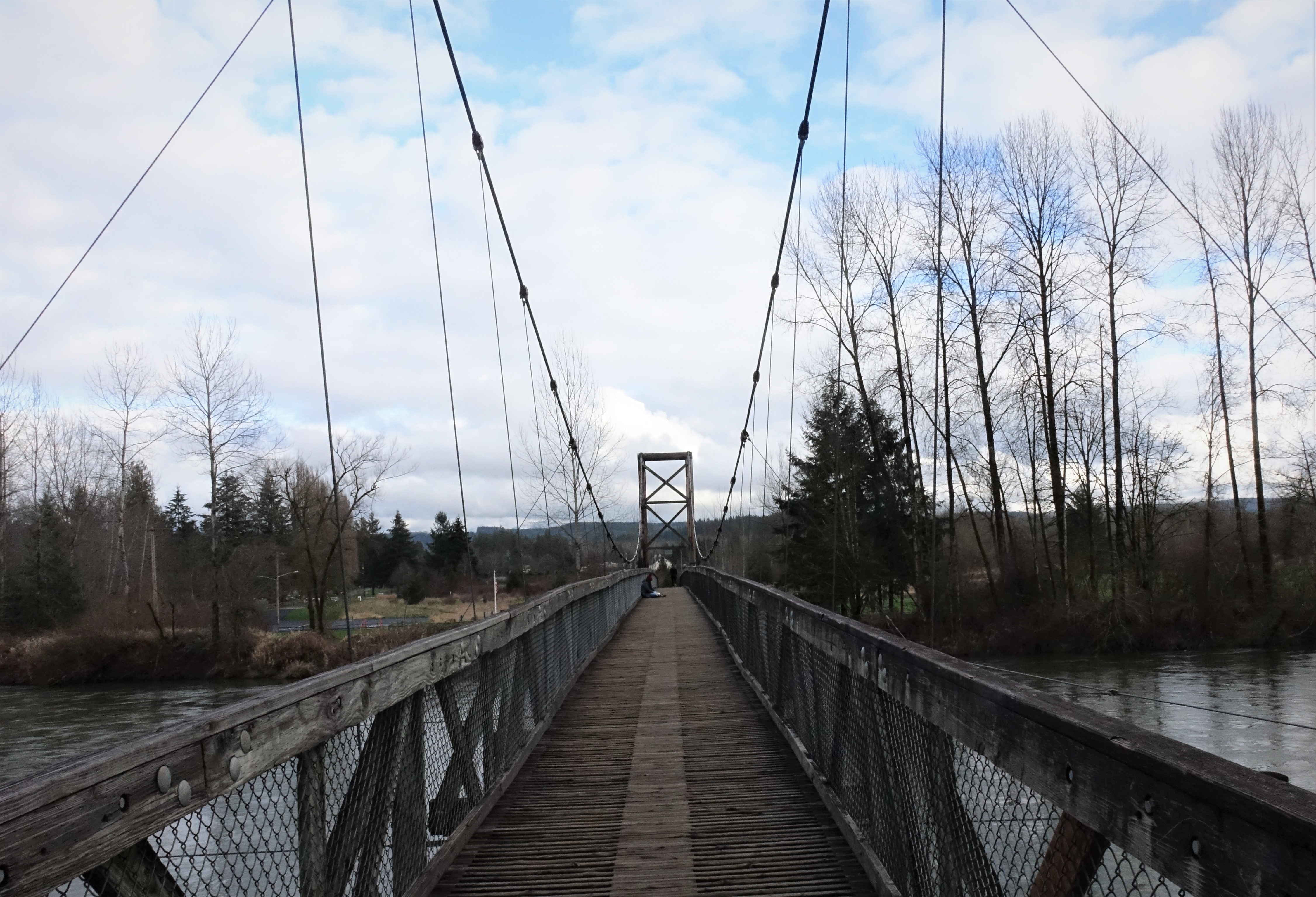 We stopped in Duvall for lunch – brunch actually – and split a delicious plate of homemade biscuits and gravy, eggs and country potatoes. Afterwards we went to nearby Tolt MacDonald Park in Carnation, a state park and campground that straddles the Snoqualmie River. We love crossing the suspension bridge and admiring the views of the river.