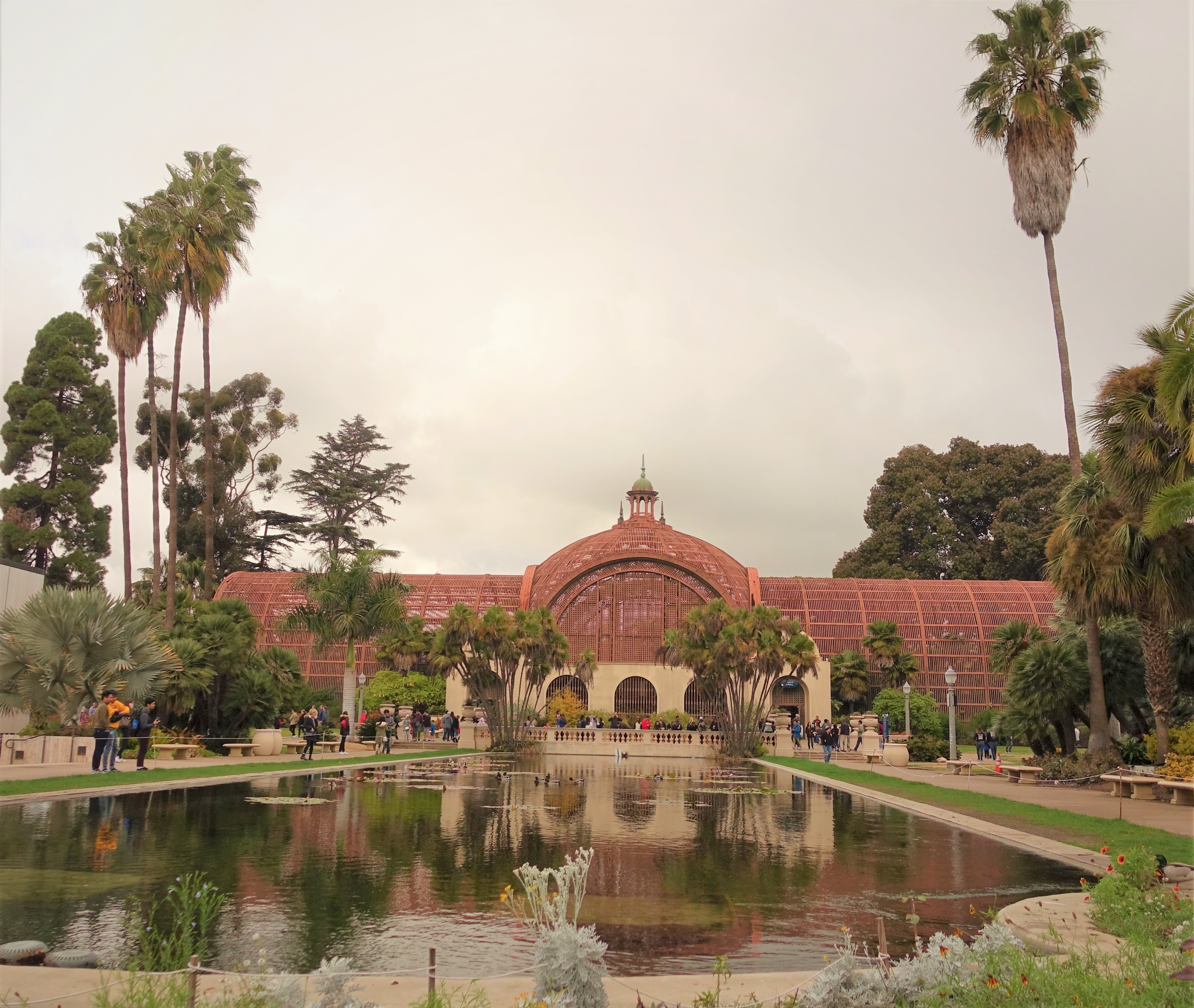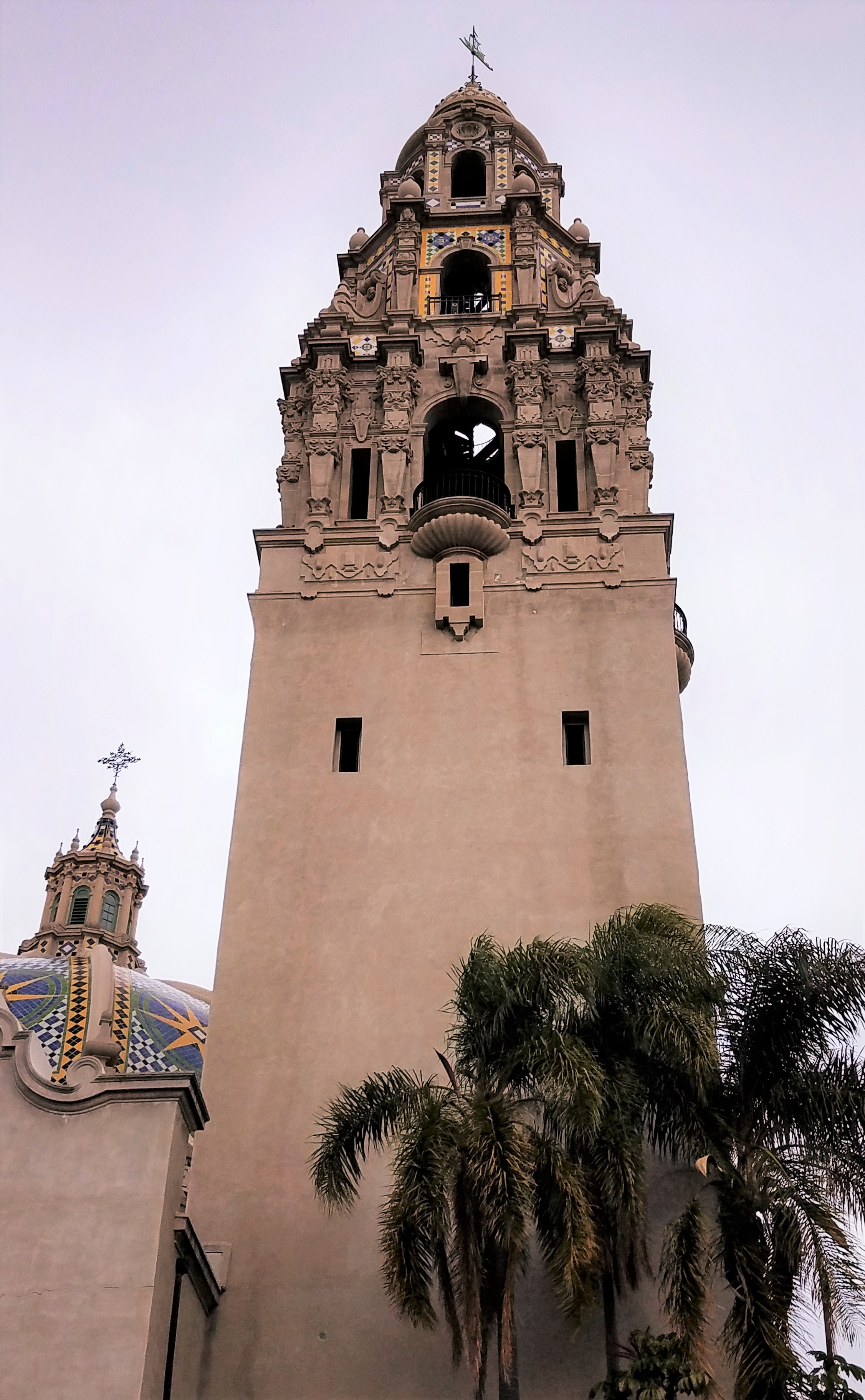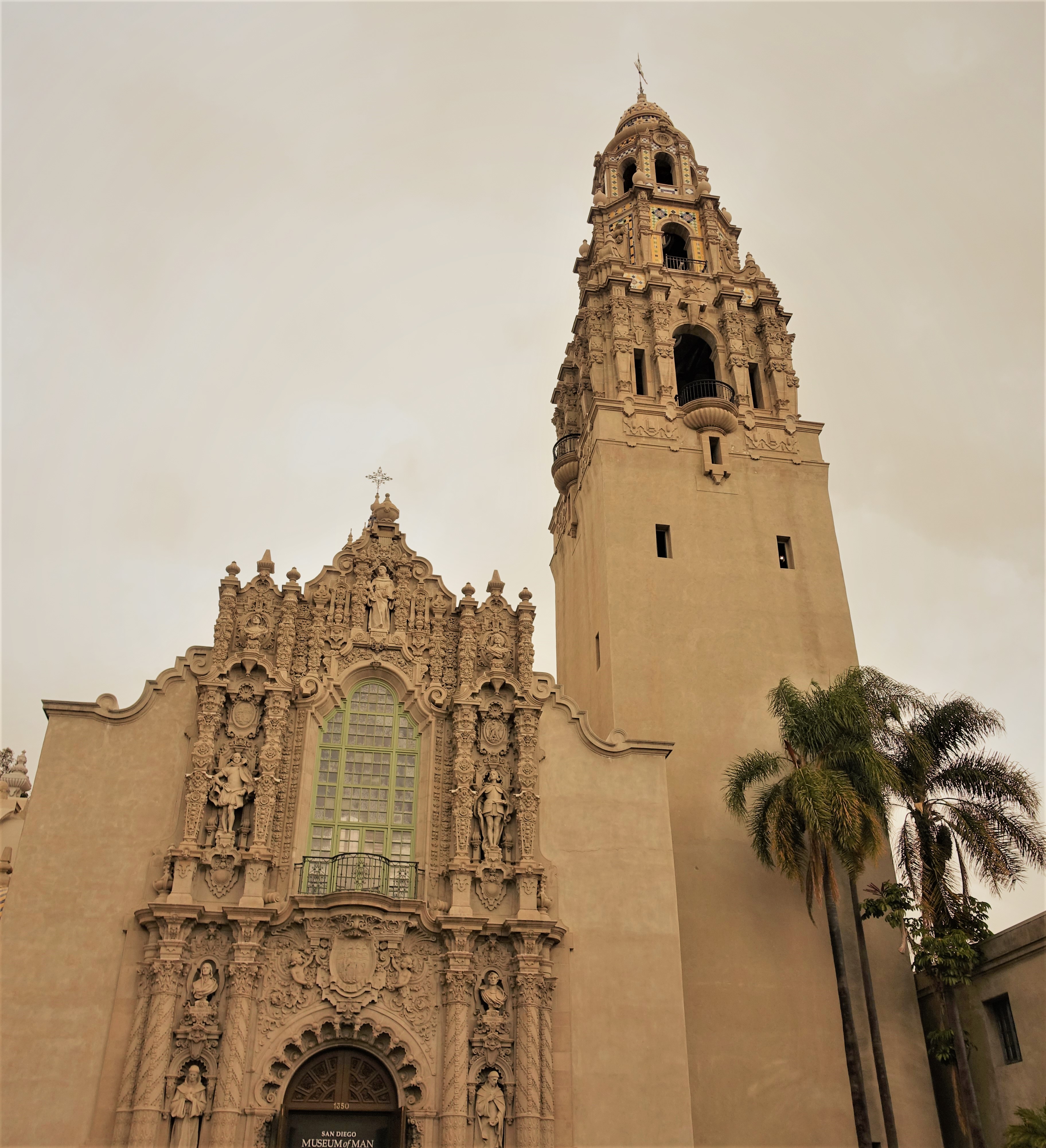 It never rains in San Diego except when it does. Fortunately we’d already planned to spend the day at Balboa Park where we could hide in museums when necessary. So I left Bob at the Air and Space Museum and roamed among the gardens and grounds taking pictures of the historic buildings under gray and cloudy skies.