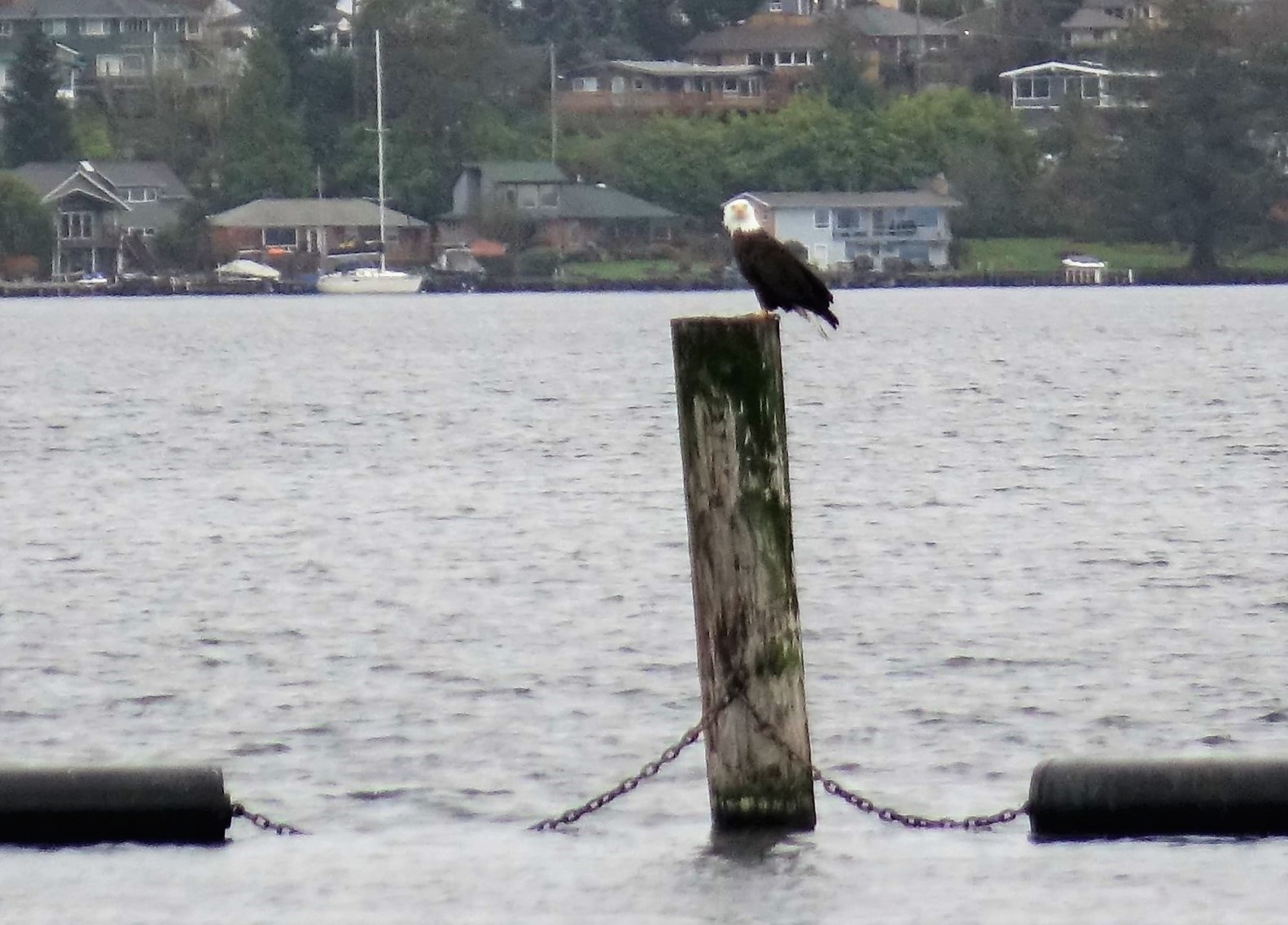 But on the next day’s walk in the park (still raining), the eagle landed on a piling long enough for me to get a picture.