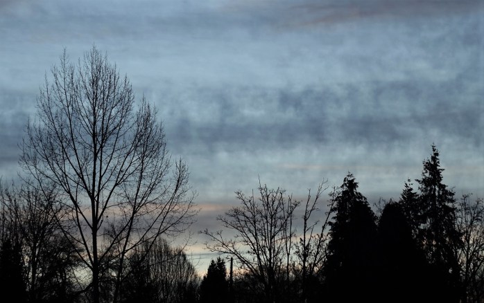 When I returned home it was almost time for sunset and I managed to catch a hint of color through the trees along with gray smudged clouds.