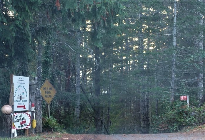 But it was steep and gravel and one lane only and we were reluctant to drive it. And we were just as reluctant to leave our car at the top and walk down the road as daylight was running out. So we continued on 101 hoping there would be another way. And then we saw the new sign ahead; and a new road that although steep was paved with two lanes and would take us safely down to Pleasant Harbor.