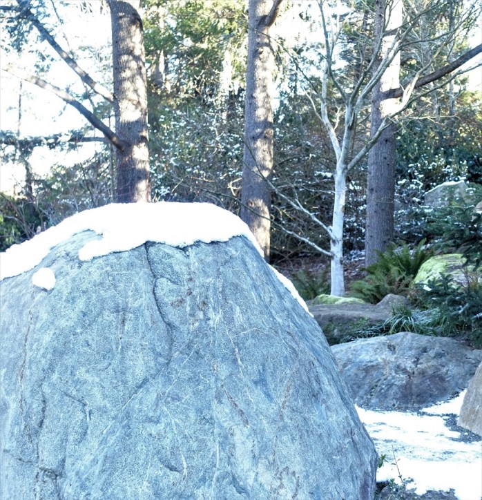 Indeed. We wander alone through the park, save for one friendly walker who wishes us a happy new year, savoring the quiet and beauty of the trees and ponds and bridges and even the boulders left from the last glacier 12,000 years ago.