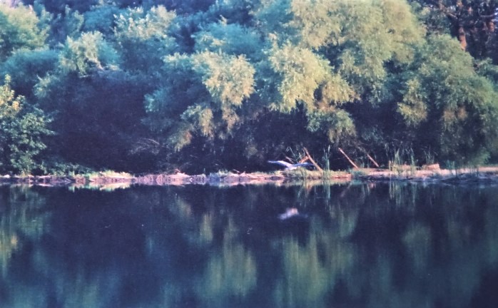 I’m resting on the shore, absorbing the heavy rays of August sun, watching a tall, elegant bird, peering into the water’s edge. There’s a thick, summer stillness and almost imperceptible sound rising from the ripples caused by fish and the insects skirting over the lake. Then lift off as the wings soar. We are in Kansas.