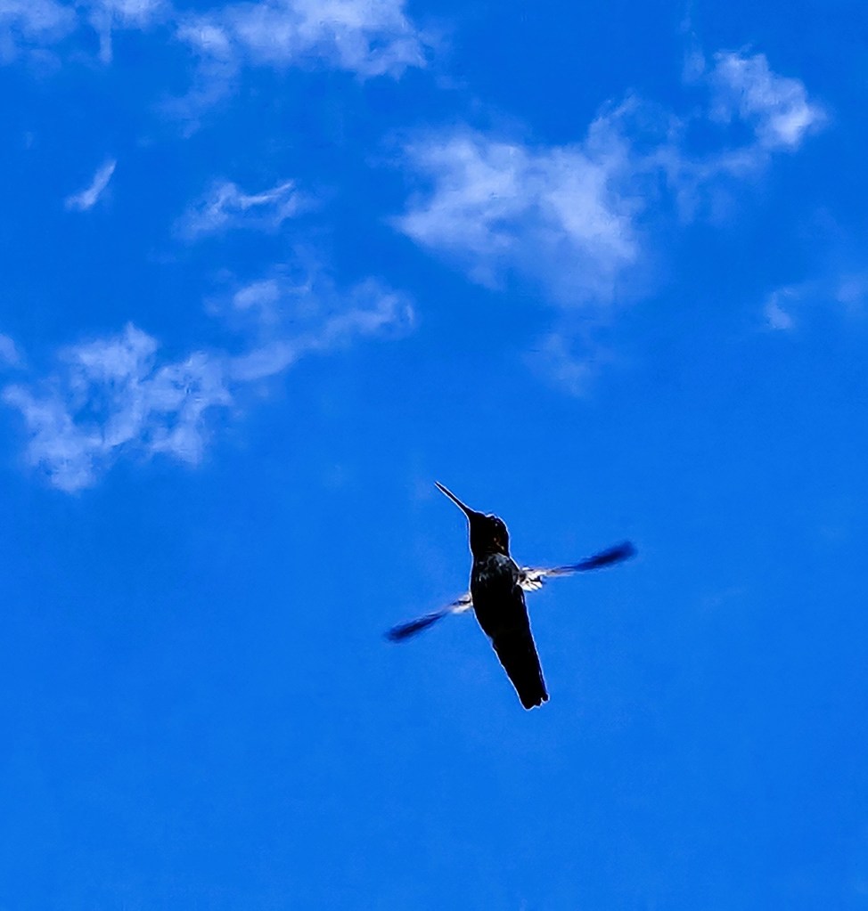 I’ve been trying to capture hummingbirds in flight (not as easy as I’d hoped) and got an unusual silhouette that will work for white and blue.