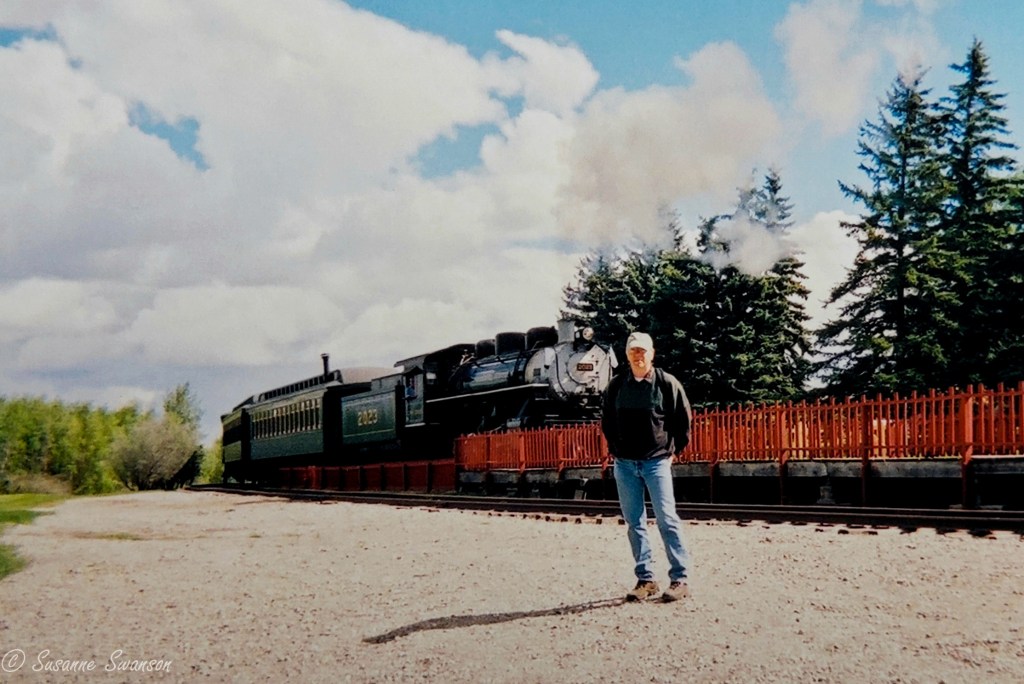 I also took his picture in front of Steam Train #2023 at Heritage Park in Calgary, Alberta. In fact, we’ve visited several parks in Western Canada with steam trains, including one in Edmonton, where soon after we boarded Bob disappeared. A few minutes later he returned and said, “I hope you don’t mind. I’m going to ride up front with the engineer.” No, I didn’t mind, and the memory still makes me smile. 🙂