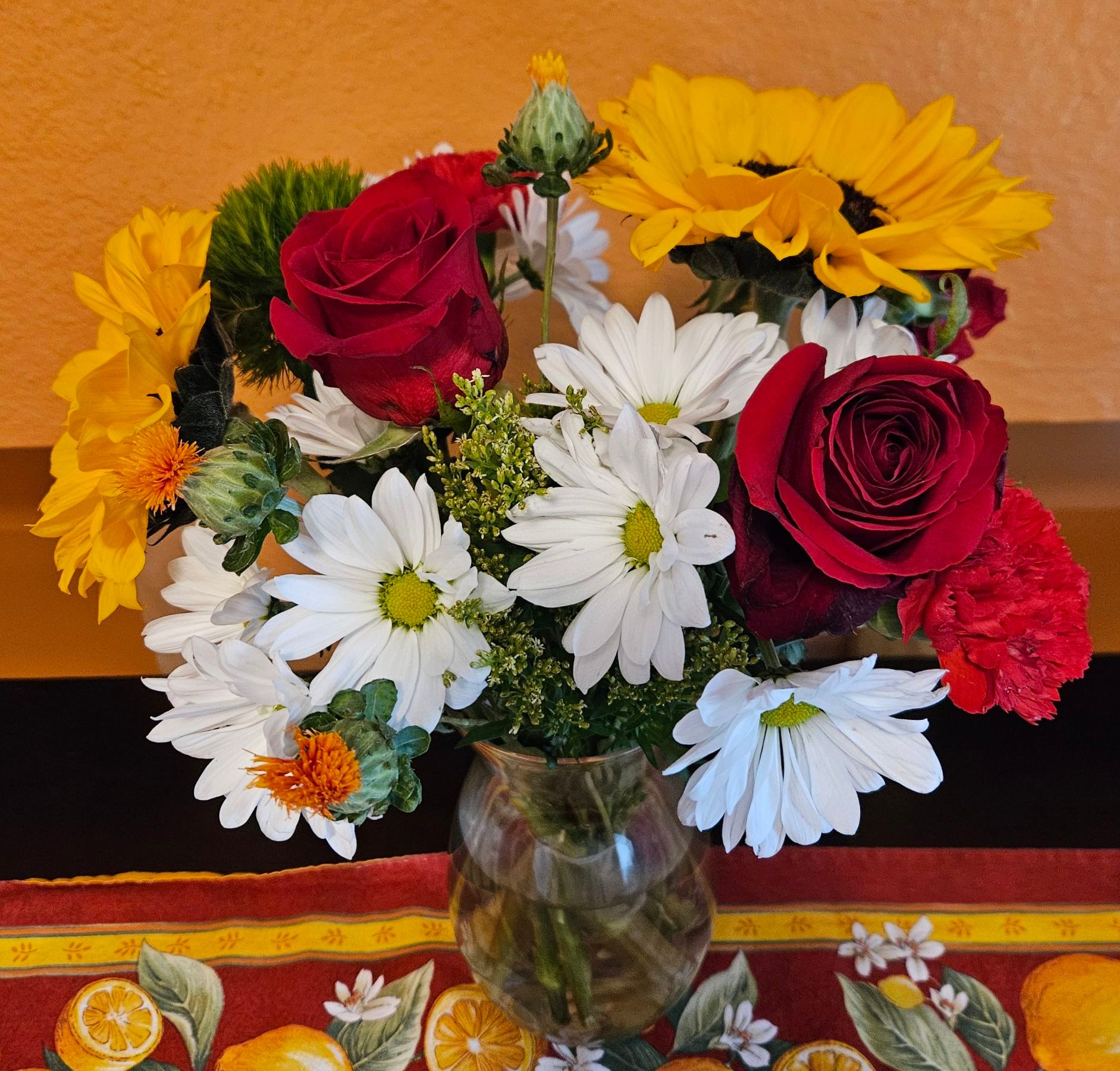 A lovely bouquet from my husband. A kitty returned in a rainstorm, the same kitty who walked across my keyboard while I was playing, improving the sound from piano to strings, now sitting on my lap, while I watch the hummingbirds. ~ Susanne